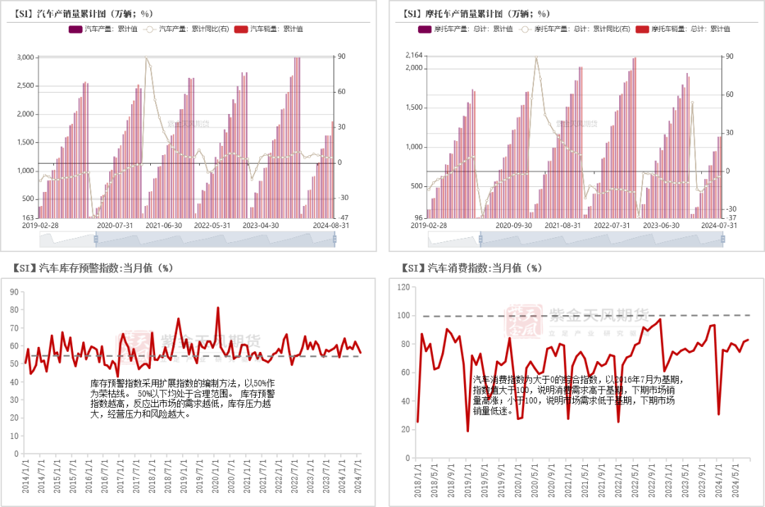 2024年1-8月,汽车产销累计同比分别为4.5%、3.0%,一定程度上受到年初以来汽车价格战以及“以旧换新”政策落地的驱动,但消费指数、库存预警指数同样指向了行业需求提振的难度,后期需关注需求侧增长空间及出口压力。