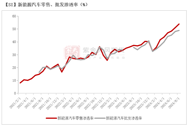 截至2024年7月,新能源汽车产量、销量累计同比增速分别达到32.9%、31.12%;2024年8月,国内新能源汽车批发、零售渗透率分别达到48.9%、53.9%,同比分别增长37.0、44.5个百分点。