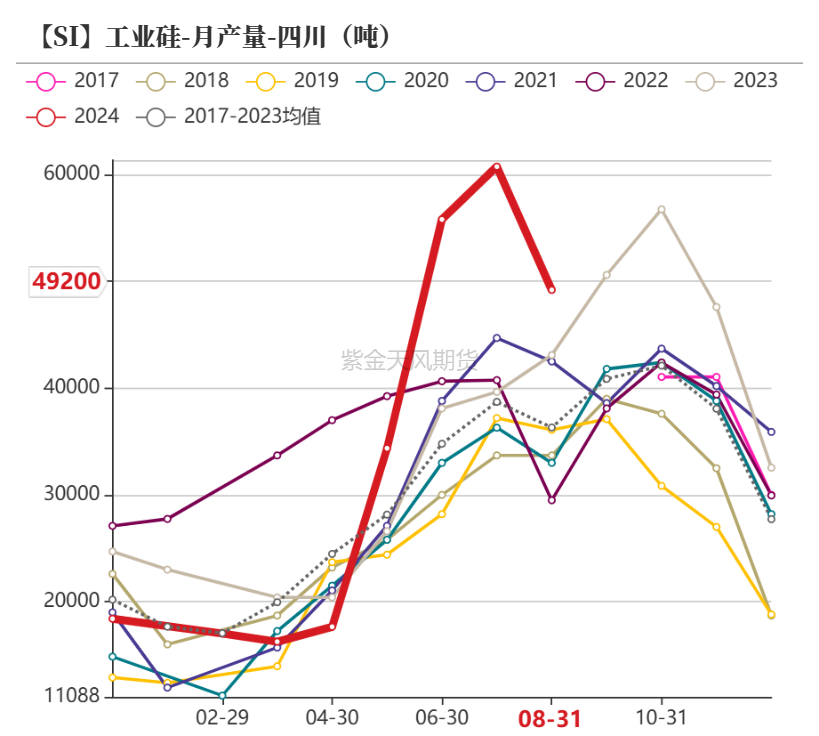 8月底四川地区高温叠加降水偏少,电力一度紧缺,对当地工业硅、多晶硅生产造成扰动,但从实际情况看,工业硅生产受影响程度较小。
