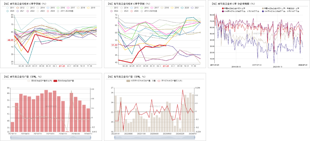 2024年1-7月,硅铝合金整体表现疲弱。春节期间原生铝合金、再生铝合金开工率降至历史最低后修复缓慢,且由于下游实际需求有限,订单增量不足,再生铝合金开工率、产量均较往年有所下滑,原生铝合金开工率未有明显增加。