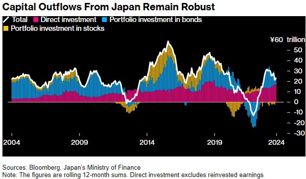 尽管日本央行结束了负利率政策,但日本经济增长乏力和人口老龄化的前景一直在鼓励当地基金经理和企业到其他地方投资。虽然今年购买外国债券的速度有所放缓,但直接投资抵消了这一下降,使总流出量保持在9.42万亿日元(660亿美元)的强劲水平。