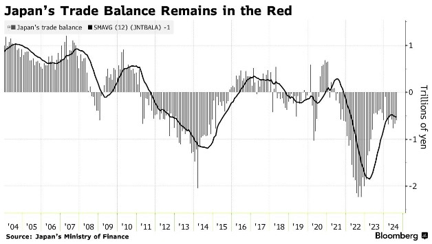 这种情况与日本的贸易平衡类似。从2022年达到峰值开始赤字便有所缩减,但经季节性调整后已连续三年保持在零以下。