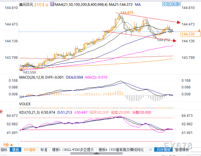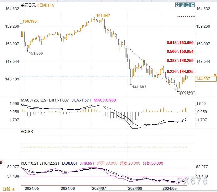 汇通财经APP讯——美元兑日元在今日(9月24日)亚欧时段(10-15点BJT)上涨了近130点至144.68,之后回落,但从回落形态来看,是很有规则的下移通道,预计很快将重启涨势。