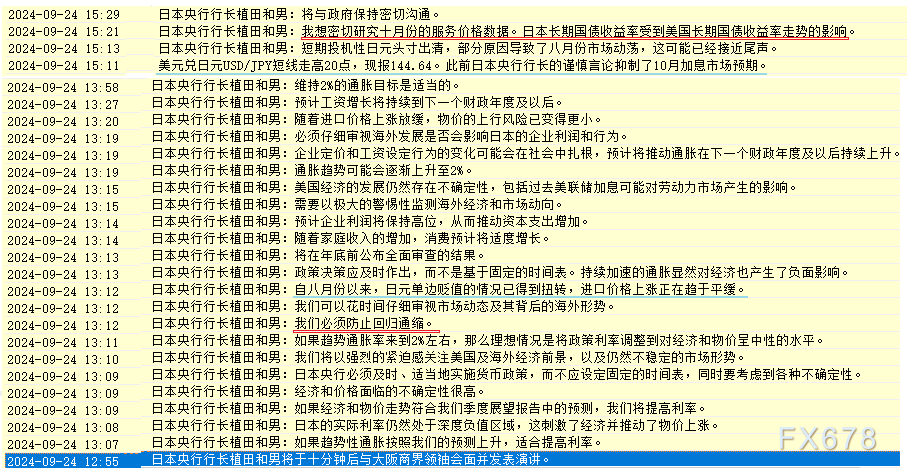 日内,日本央行行长的言论让市场对日本干预汇市的担忧消除,其言论后美元兑日元保持上涨。以下是日本央行讲话的截图展示(倒叙),可自行研究。其中,日本央行行长说想要仔细研究10月份的服务价格指数,因此,届时可重点关注该数据影响。