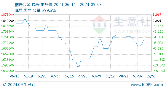 9月9日,生意社镝铁合金基准价为1765000.00元/吨,与本月初(1705000.00元/吨)相比,上涨了3.52%。