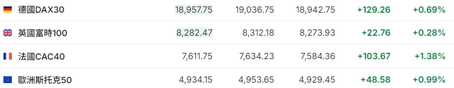 2.截至发稿,德国DAX指数涨0.69%,英国富时100指数涨0.28%,法国CAC40指数涨1.38%,欧洲斯托克50指数涨0.99%。