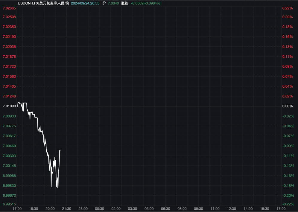 8月份以来,人民币对美元汇率开启快速上涨模式。9月,在美联储降息、国内宣布一系列重要政策影响下,人民币汇率于9月25日突破7.0关键点位。数据显示,截至25日8:55,离岸人民币对美元汇率报7.0040元,较前收盘价涨69个基点,盘中最高报6.9952元,升破7.0元关口,为2023年6月以来首次。截至9月24日,7月以来,离岸人民币对美元汇率已累计上涨3.96%。