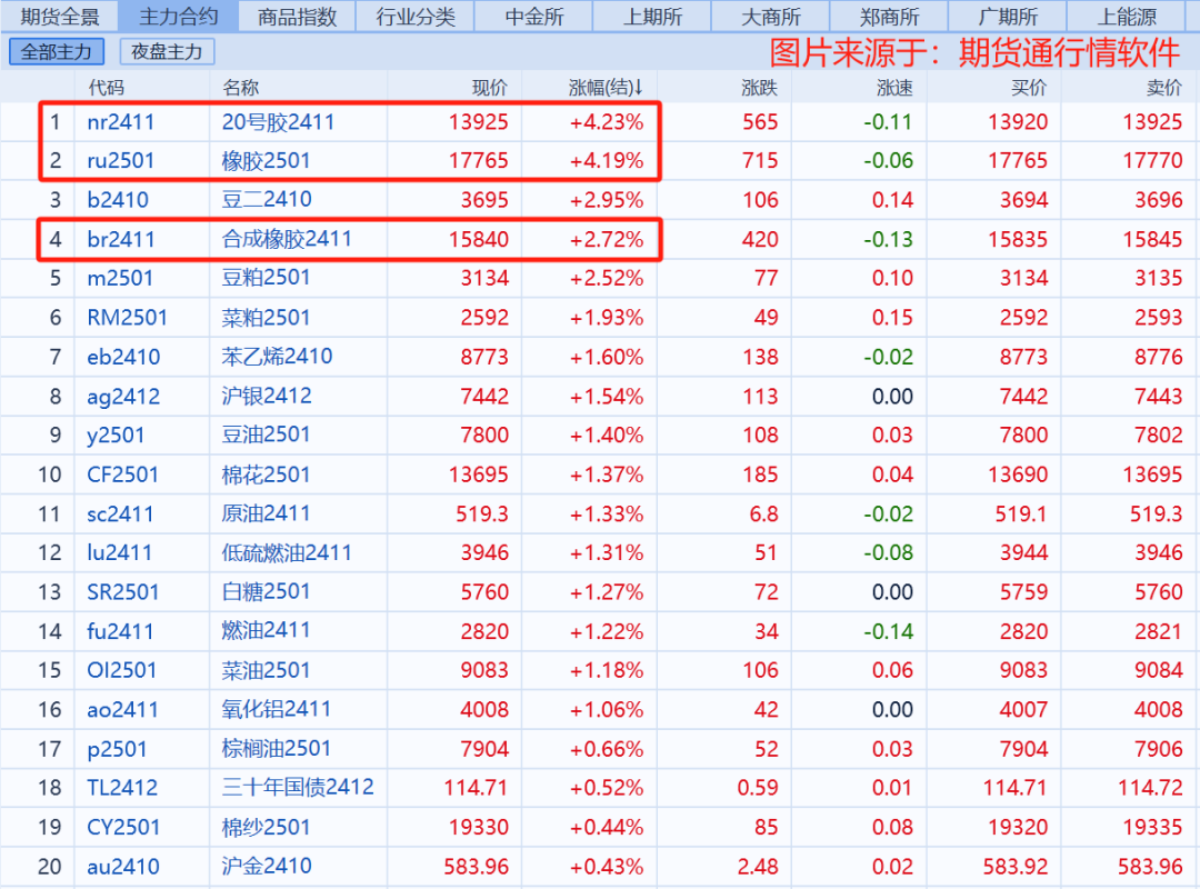 9月18日本周三,中秋节假期后首个交易日,早盘时段截至10:30时,国内期市整体表现强弱分化,其中,国内橡胶相关期货品种,延续节前偏强运行节奏,20号胶和天然橡胶主力合约,涨幅分别超4%,涨幅榜居前;合成橡胶主力合约,涨幅超2%。
