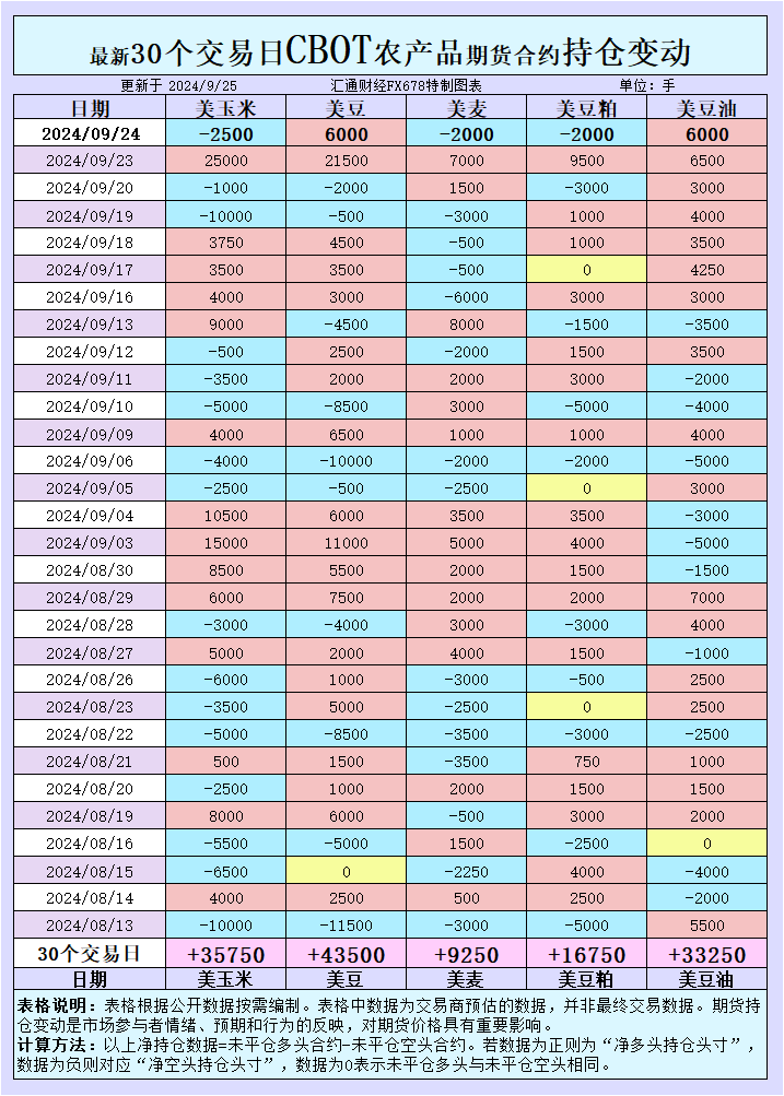 玉米期货同样面临供应过剩的压力,9月1日美国玉米库存达到四年来最高水平,较去年同期增长35.6%。尽管如此,基金持仓显示出玉米净空头有所增加,表明市场对短期内玉米价格的下行预期较为明确。