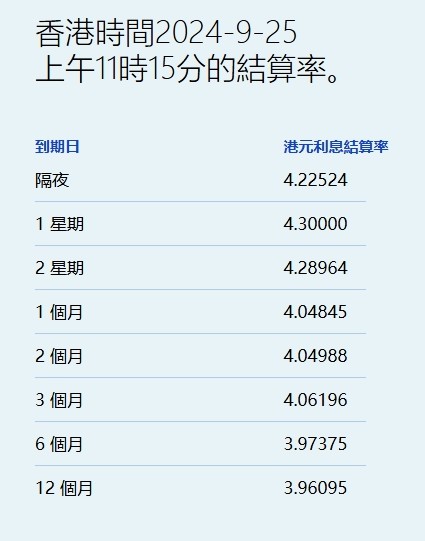 9月25日,港元拆息几乎全线微升,仅一年期回落。其中,隔夜息报4.22524%,创逾三周新高,与楼按相关的一个月拆息亦连升四天,报4.04845%,为8月21日以来最高。