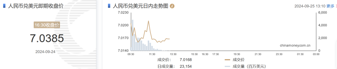 中国人民银行授权中国外汇交易中心公布,9月25日,人民币兑美元中间价报7.0202,调升308个基点,创2023年5月22日以来新高。前一交易日中间价报7.0510,在岸人民币16:30收盘价报7.0385,夜盘收报7.0318。
