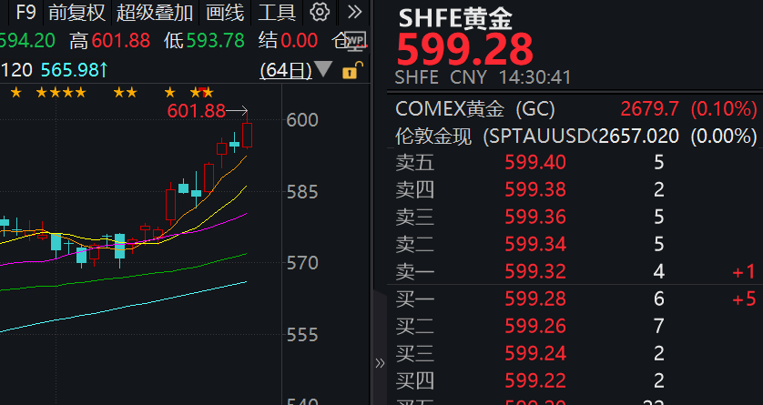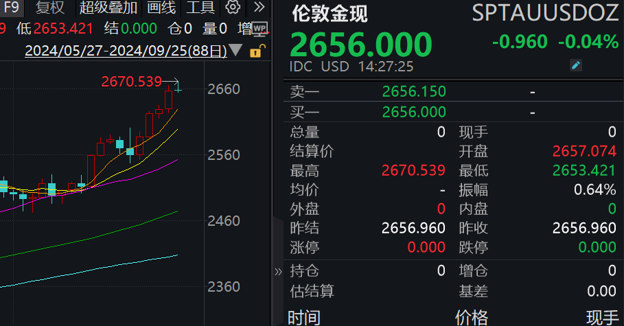 消息面上,截至25日14:26,现货黄金涨至2656美元/盎司上方,再创历史新高。沪金期货首次涨至600元/克,续创新高,9月25日,各大品牌金饰报价已经突破770元/克。