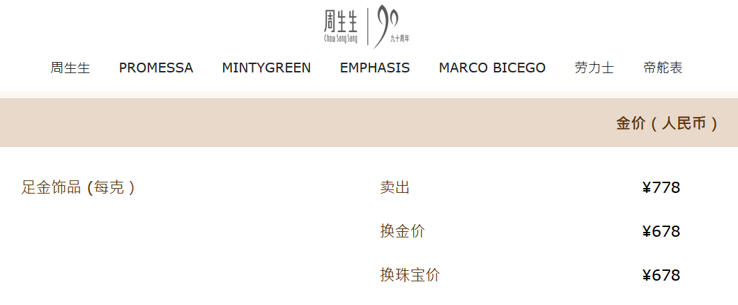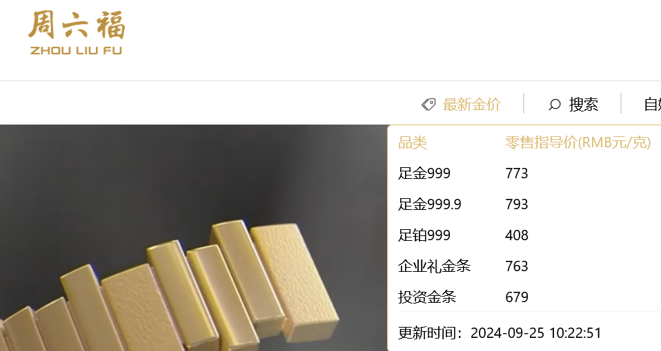 9月25日,据南财快讯记者查询,据官网数据,周生生足金饰品价格报778元/克;周六福足金999报773元/克,足金999.9报元/793克,投资金条报679元/克。