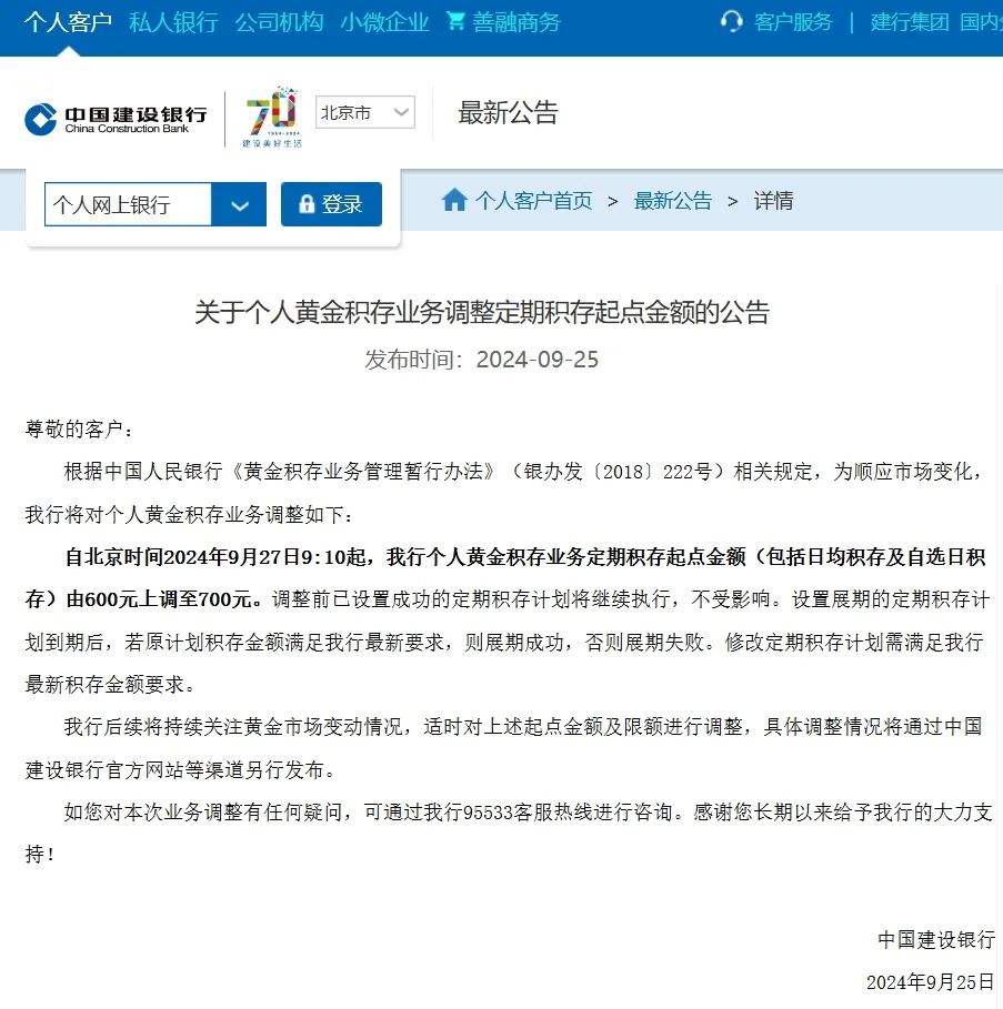 9月25日,中国建设银行公告,自北京时间2024年9月27日9:10起,个人黄金积存业务定期积存起点金额(包括日均积存及自选日积存)由600元上调至700元。调整前已设置成功的定期积存计划将继续执行,不受影响。