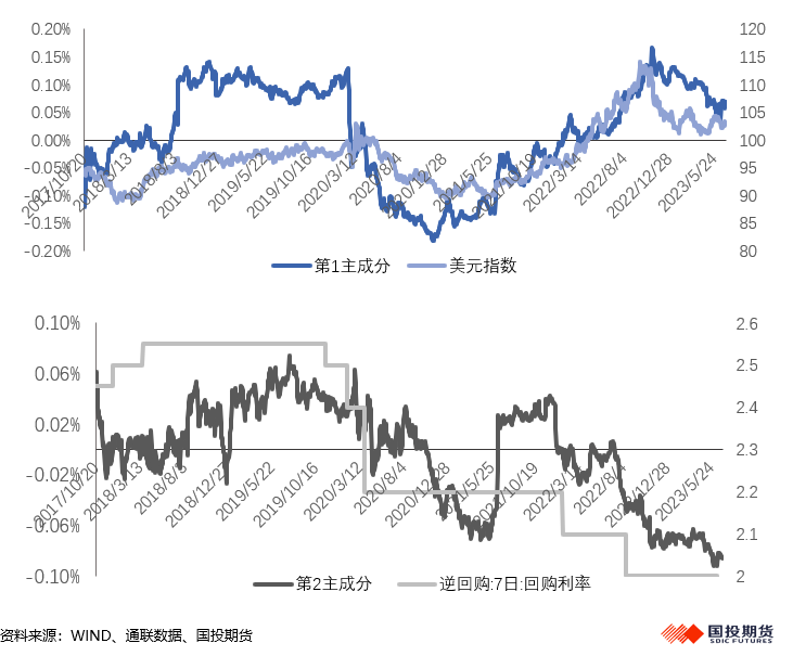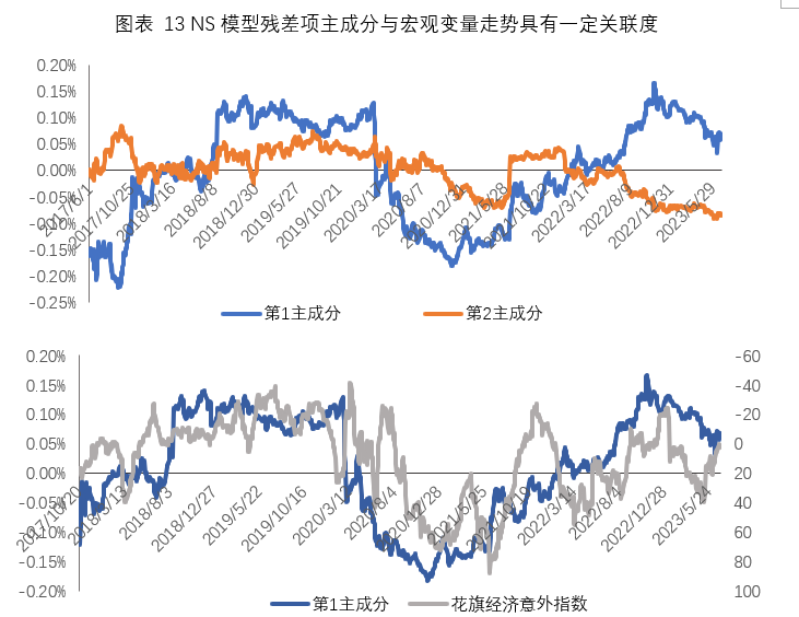 在上一部分中文章通过NS模型对拟合债券收益率曲线,以10年期国债收益率为例,我们发现通过NS拟合得到的收益率与真实利率间存在一定的偏离,即模型残差项,为检验残差项中是否包含未反映到NS模型中的剩余有效信息,我们对残差项序列进行了白噪声检验,结果显示残差项为非随机游走序列,该结果侧面反应了残差项中可能存在影响债券收益率的隐含信息,经分析我们推测这可能与宏观经济环境的有关。我们通过主成分分析提取出期限在10年以上债券收益率的残差项,选择前两个主成分进行分析(第一、第二主成分累计解释度分别为81%、94%),通过计算我们发现主成分与宏观经济数据存在一定相关性。从样本内拟合结果我们可以发现第一主成分与花旗集团发布的经济意外指数、美元指数具有较高相关性,第二主成分与七天逆回购利率较为相关,这在一定程度说明经济环境、货币政策等宏观因素会对收益率曲线产生影响。