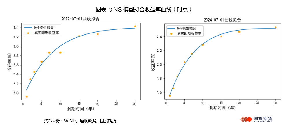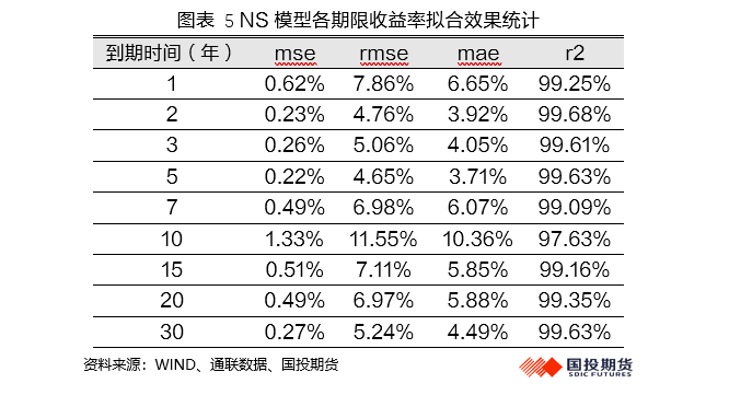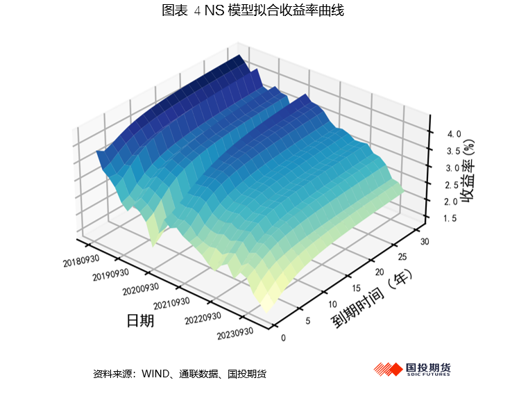 本文中我们选择采用Nelson-Siegel(NS)模型来拟合收益率曲线,主要源于以下几点考量:1)模型复杂性:NS模型可以通过较少的参数来刻画收益率曲线的形态,相比于SV模型其参数稳定性更优。2)灵活度:NS模型可以刻画多种利率期限结构,模型具有较强适应性和灵活度。3)经济含义:NS模型中参数具有明确的经济学含义,模型具有较高解释度。