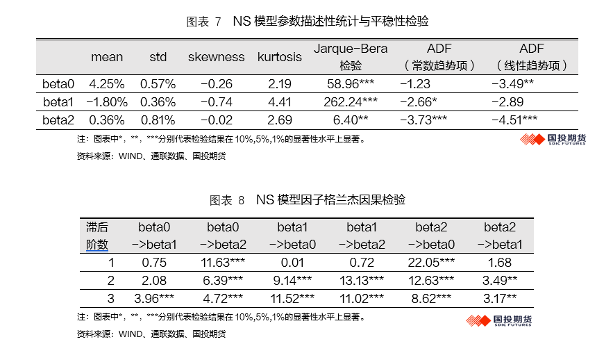 在构建动态NS模型前,我们需要对参数进行平稳性检验,ADF单位根检验结果显示斜率与曲率因子序列平稳,水平因子中存在线性趋势项,经差分处理后序数据平稳。为了解因子间是否存在一定相关关系,文章采用格兰杰因果检验对因子滞后三阶数据进行分析,检验结果显示三因子之间存在一定的格兰杰因果关系,其中水平与曲率因子之间在滞后一阶下存在显著因果关系。