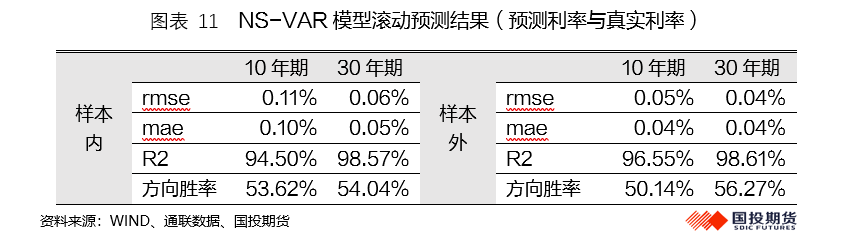 基于以上分析结果,我们尝试采用向量自回归(VAR)模型对NS模型三因子进行滚动预测,参考AIC、BIC滞后阶数为1阶,构建VAR(1)模型,期间我们发现若将水平因子进行差分后再建模会丢失很多原始信息,因此该部分我们采用水平因子原始数据进行建模,同时为测试模型估计参数是否稳定,对模型残差项进行了稳定性检验,结果显示参数平稳,模型估计结果稳定。