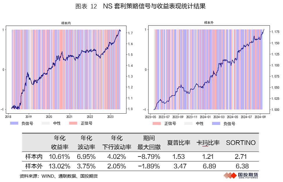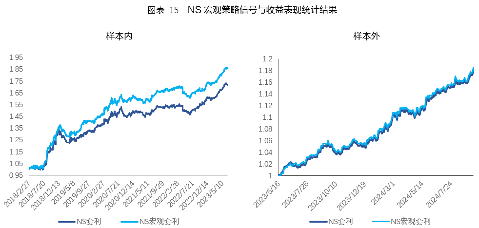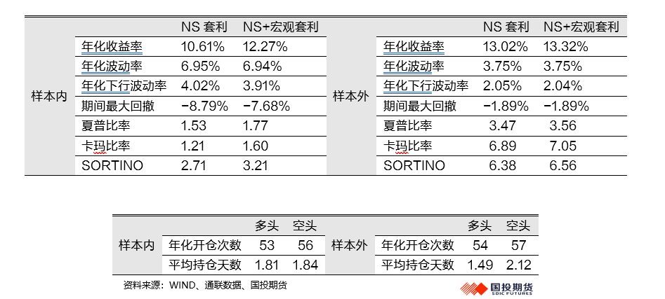 策略表现方面,基于动态预测的NS套利策略在样本内外的年化收益率分别为10.31%与13.02%,夏普比率分别为1.53与3.47。经宏观因子调整后的NS宏观套利策略在样本内外年化收益率分别为12.27%与13.32%,策略夏普比分别为1.77与3.56,组合在收益与风险收益表现方面均有所提升,策略年化开仓次数约55次,开仓平均持仓天数在1-2天左右。