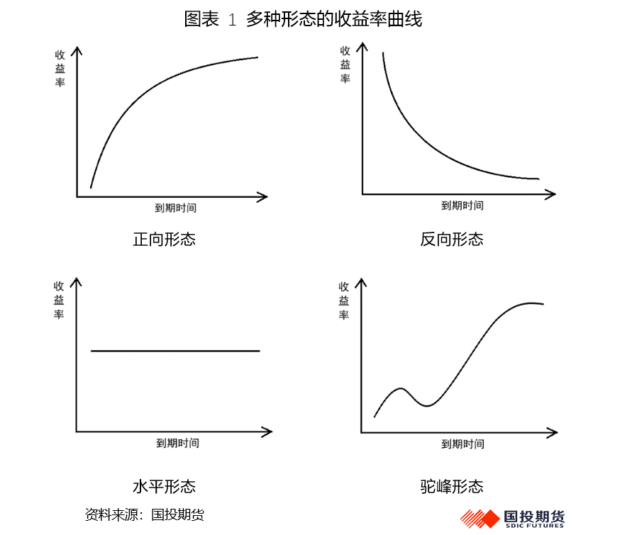 收益率曲线通常表现为以下几种形态,1)正向的收益率曲线,收益率曲线呈上凸形态居多,曲线整体斜率为正,反应出投资者对于长期债券要求的风险补偿。2)反向的收益率曲线,该形态通常出现在市场对未来经济预期较为悲观时,由于大量资金会倾向于配置长债资产避险,相应推高长债价格使得收益率被压低,使得曲线斜率走平甚至达到负斜率状态。3)水平的收益率曲线,这类形态一般在过渡阶段出现,当短端收益率快速抬升(熊平)或长期收益率快速下降(牛平)时曲线会短期接近水平形态。4)驼峰的收益率曲线,这里驼峰指的是中间期限债券的收益率高于两边期限收益率,使得曲线出现局部极值,这类情况较少见,有可能是债券流动性溢价所致。