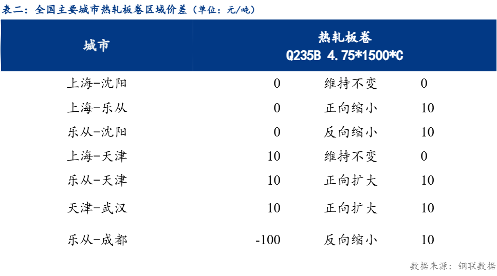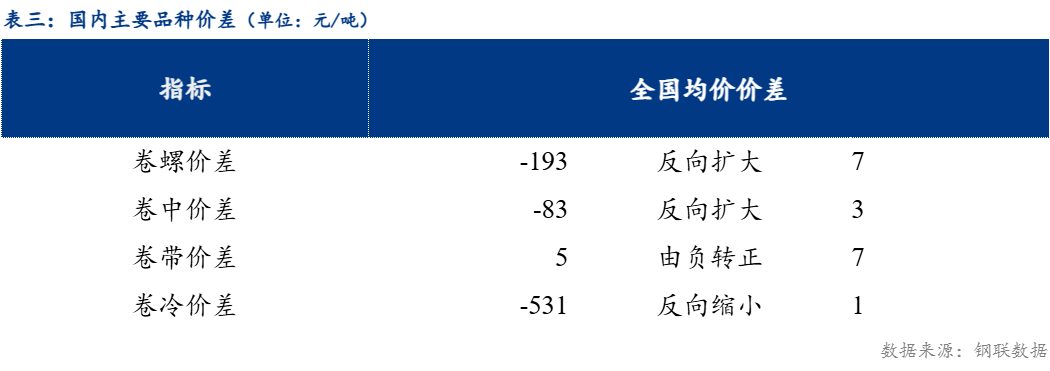 从品种价差来看,卷螺差较上一交易日反向扩大7元/吨,热中价差较上一交易日反向扩大3元/吨,热带价差较上一交易日由负转正7元/吨,热冷价差较上一交易日反向缩小1元/吨 。