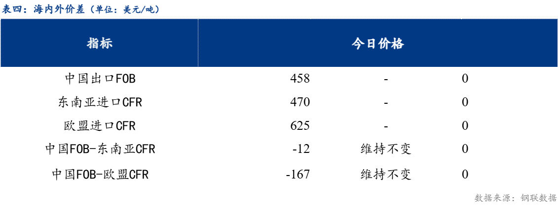 从区域价差来看,华东与东北价差0元/吨,较上一交易日维持不变;华东与华南价差0元/吨,较上一交易日正向缩小10元/吨 ;华南与华北价差为10元/吨,较上一交易日正向扩大10元/吨。