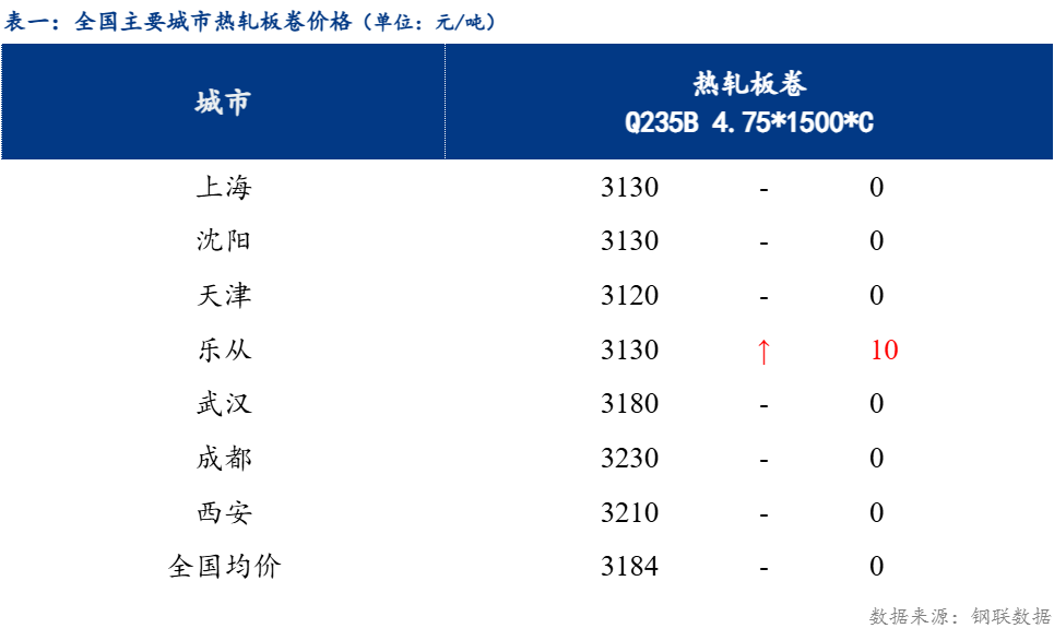 截止发稿时4.75热轧板卷全国均价3184元/吨,较上一交易日持稳。其中主要城市价格为上海3130元/吨,沈阳3130元/吨,天津3120元/吨,乐从3130元/吨,武汉3180元/吨,成都3230元/吨,西安3210元/吨。