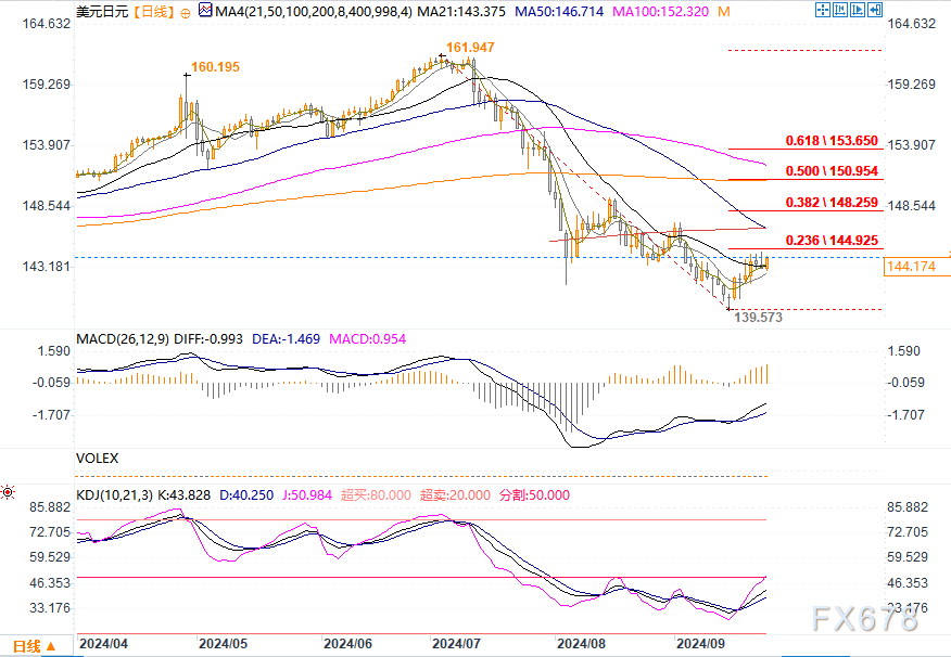 汇通财经APP讯——周三(9月25日)欧市时段,美元兑日元较亚市加快反弹,欧市已反弹逾百点最高值144.25,此反弹属于技术性反弹。此前两日持续回踩行情,今日反弹关注能否冲破昨日所创的三周高点144.67。