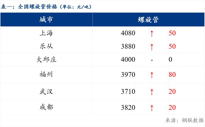 今日主流城市螺旋管价格上涨。截至发稿,219*6mm上海地区报4080元/吨,较上一交易日上涨50元/吨;乐从地区报3880元/吨,较上一交易日上涨50元/吨;大邱庄地区报4000元/吨,较上一交易日持平。