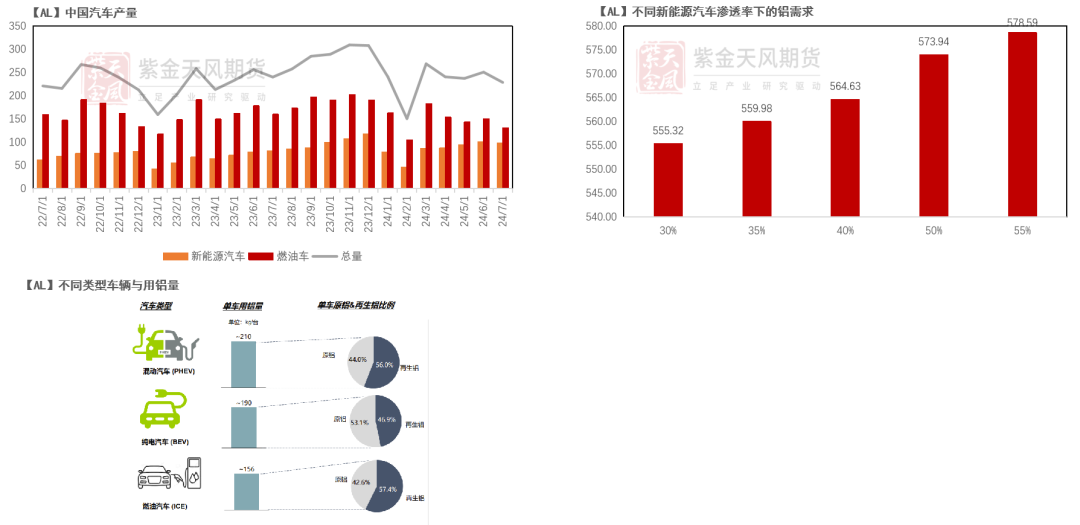 目前汽车板块铝需求的主要增量来自于新能源汽车渗透率提升带来需求增长,较传统燃油车新能源汽车的用铝量更高。