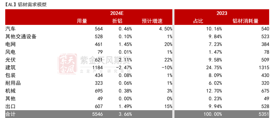 从总的需求合计角度来看,我们预计2024年计入铝材出口的总需求量约为5509万吨,较2023年同期增加约3.66%。