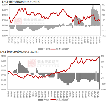 相比于2023年,2024年的有色金属交易存在明显的预期交易的特征,入2024,美联储的降息预期叠加铝在新能源领域的预期,市场宏观资金开始大量涌入做多沪铝的远期合约,铝价开始持续进入上涨态势。反应到基差与结构上,2024年的沪铝上涨伴随着明显的贴水扩大的特征,而在2023年由需求带来的上涨时,沪铝则伴随升水扩大而上涨。