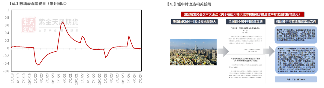 根据ALD的数据显示,2024年1-6月的建筑板块的总用铝量的需求较去年同期下跌约6.38%,并未出现如同最终的竣工数据的大跌,同时与建筑用铝(门窗、室内装饰)密切相关的玻璃的表观消费量亦仅仅出现约3.3%的减少;