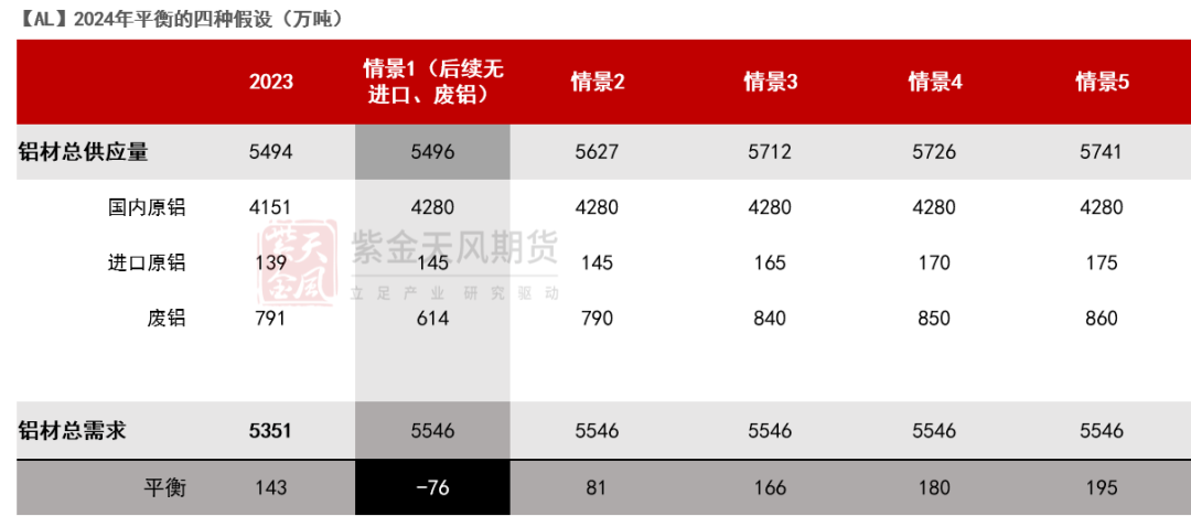 从2023年的情况来看,当年铝材供应过剩量约为136万吨,过剩量约为2.4%,而从2024年的四种情形来看,若废铝供应以及原铝进口依旧保持目前的高位,我们认为铝市场将会进入过剩态势;
