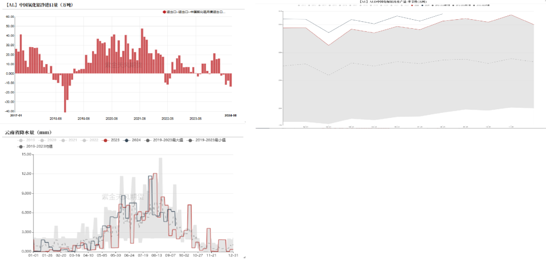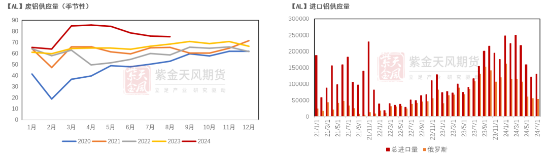 以近两年为例,在2023年宏观复苏预期转好的3-4月,4月全口径铝累计供应增速为6.22%,而随着5-6月的宏观预期转弱,7月的全口径铝供应增速约为5.46%,其供应增速较前两个月的明显回落。而2024年,在远期乐观预期的持续交易下,铝价格持续冲高,对应的铝供应(以废铝、进口铝锭为主) 出现显著性的上涨,截止2024年七月,全口径铝供应增量约为9.98%。