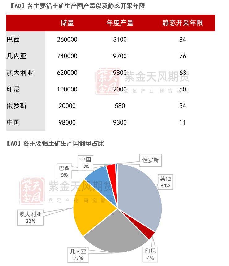 从总量储量的角度来说,作为地表中最为丰富的元素之一,铝元素的总体储量是极为丰富的。目前主要铝土矿生产国储量以及产量对比来看,即便未来无新铝土矿资源勘探出来,铝土矿开采也可维持较长的时间。其中巴西、几内亚、澳大利亚等主要矿石出口国矿山静态开采年限分别为84、76和63年。同时需要注意到的是,中国铝土矿可开采年限较短。