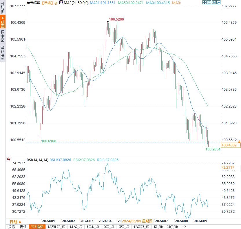 从实际的市场交易情况来看,美元已经显现出疲态。虽然短期内美联储降息的概率较高,但部分交易员开始押注11月份再度降息的可能性。目前市场对11月再次降息50个基点的概率估计约为50%。美联储主席鲍威尔在最近的讲话中也明确表示,市场不应假设50个基点将成为降息的“新步伐”,未来的政策路径将根据经济数据动态调整。