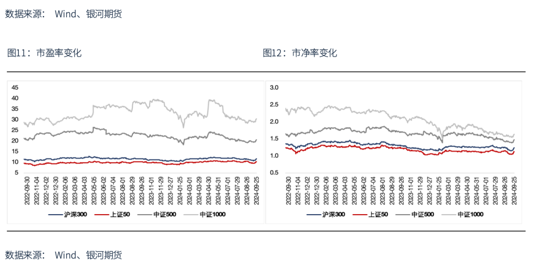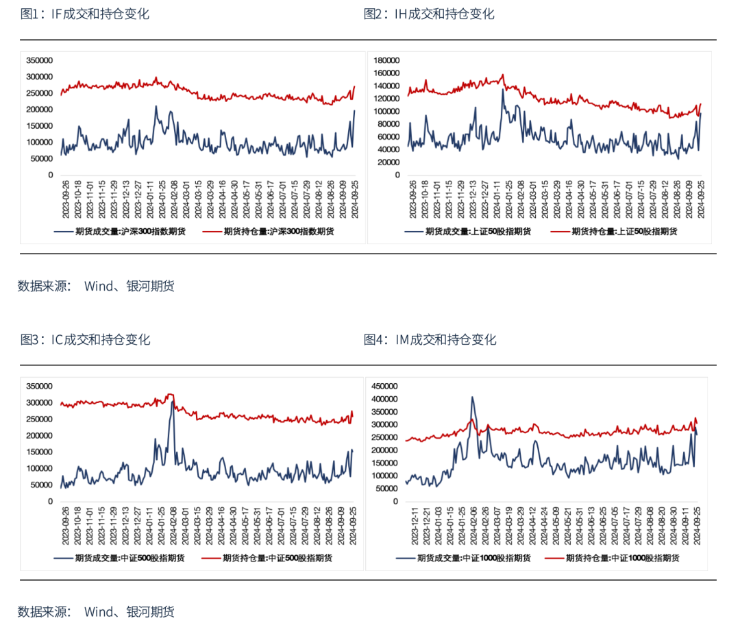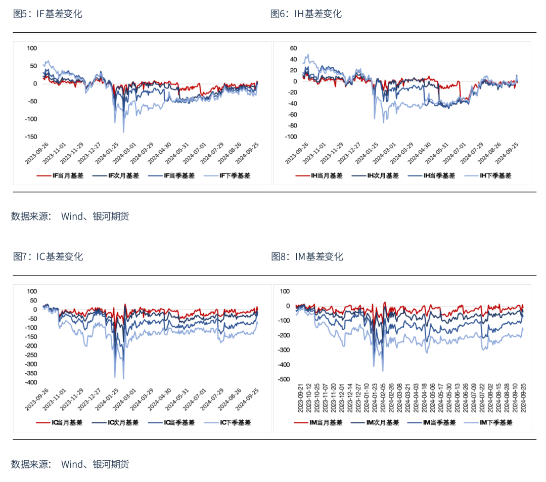 股指期货随现货反弹,至收盘,主力成交合约IH2410涨1.58%,IF2410涨1.71%,IC2410涨1.31%,IM2410涨1.12%。虽然期现货继续保持上涨,市场热情有所降温,各品种基差有所下降,IH和IM当月合约出现贴水。IF和IH成交分别增加15.6%和11.6%,IC和IM成交分别下降4%和9.3%;IC和IM持仓分别下降6.1%和6.3%,IF和IH持仓双增加2.7%。