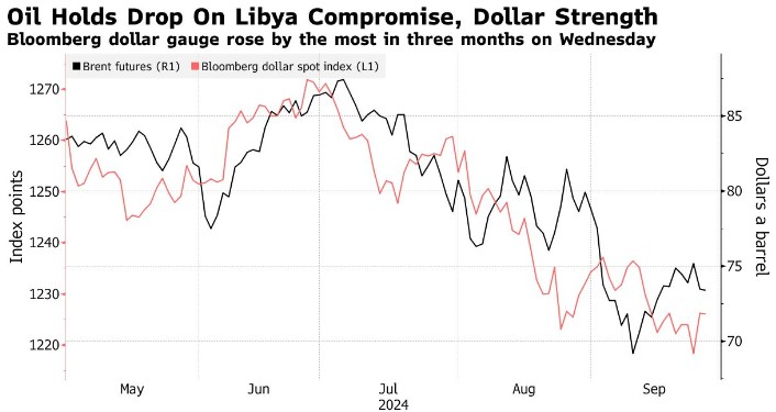 智通财经获悉,由于利比亚各派系就欧佩克成员国央行的领导权达成“妥协”,为恢复部分原油生产开辟了道路,市场对利比亚供应受扰的担忧有所缓解,美国和法国寻求敲定以色列-真主党临时停火计划,另外,市场对需求的担忧仍挥之不去。布伦特原油周三下跌2.3%至每桶73美元上方,WTI原油跌至每桶70美元以下。联合国表示,利比亚对立的东西方政府代表就银行董事会的步骤“草签了一项协议”,签署仪式将于周四举行。