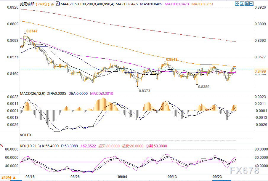 技术面来看,美元兑瑞郎近日在0.8400-0.8540区域形成横盘震荡,日图似有反弹迹象。但4小时图目前正在逼近200均线压力位。★ 若瑞士央行降息25个基点,瑞郎将走强,美元兑瑞郎将重新朝该横盘区间下沿运动,支撑依次关注0.8464、0.8416、0.8389-0.8373,若触及0.8389下方可能会吸引买盘入场,毕竟美元明显有利差优势。 ★若瑞士央行降息50个基点,则瑞郎将走弱,美元兑瑞郎将站上该4小时图200均线,并打开上涨空间,上方阻力依次关注0.8550-0.8560、0.8662及0.8720,但更上方不远的0.8747是空头狙击的一个理想点位,就是趋势上涨也会出现明显的下探压力。