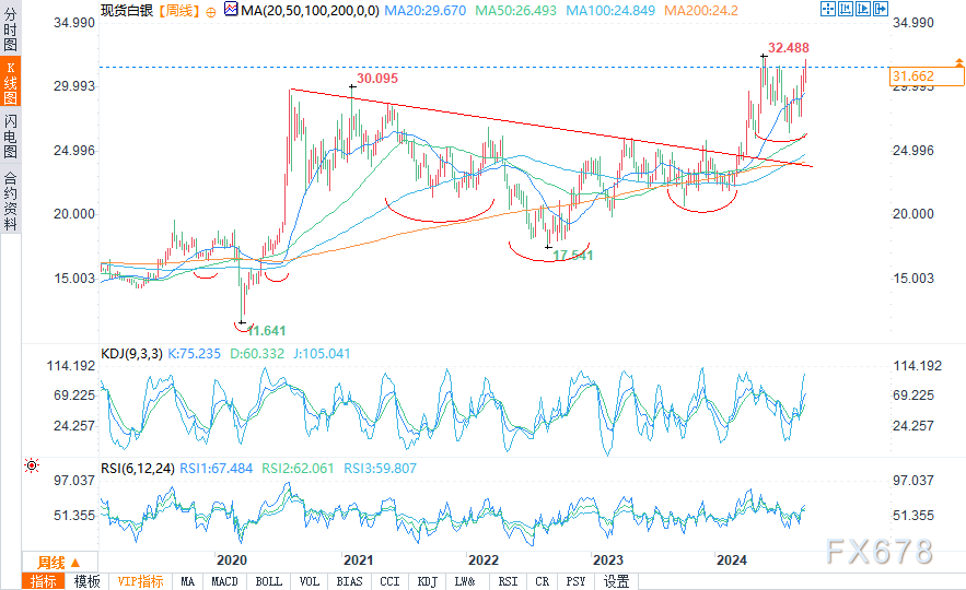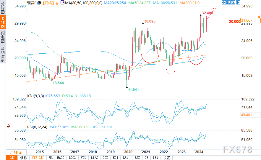 月线图上,白银价格在2021年至2023年的月度图表中形成倒置的头肩模式后,银价正试图突破30美元。2024年9月的月K线正试图收于这一关键水平之上,突破这一关键水平可能会引发银价稳步飙升至50美元。