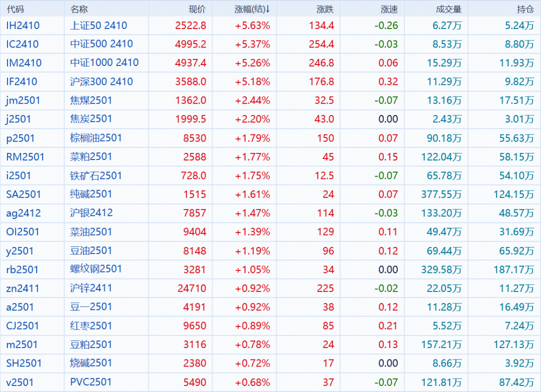沪深300股指期货(IF)主力合约涨5.01%,上证50股指期货(IH)主力合约涨5.63%,中证500股指期货(IC)主力合约涨5.37%,中证1000股指期货(IM)主力合约涨5.30%。