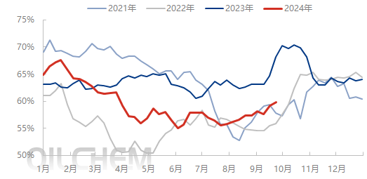 截止9月26日,中国成品油独立炼厂常减压产能利用率为59.82%,环比上周上涨0.51个百分点。山东、华东等大区部分炼厂检修结束,产能利用率有所提升。
