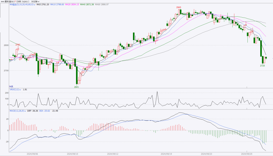 高低硫燃料油主力合约价格同步大跌,盘中高硫燃料油最大跌幅超5.5%,低硫燃料油最大跌幅接近5%。收盘时略有反弹,燃料油收盘跌幅4.88%,低硫燃料油收盘跌幅4.10%。