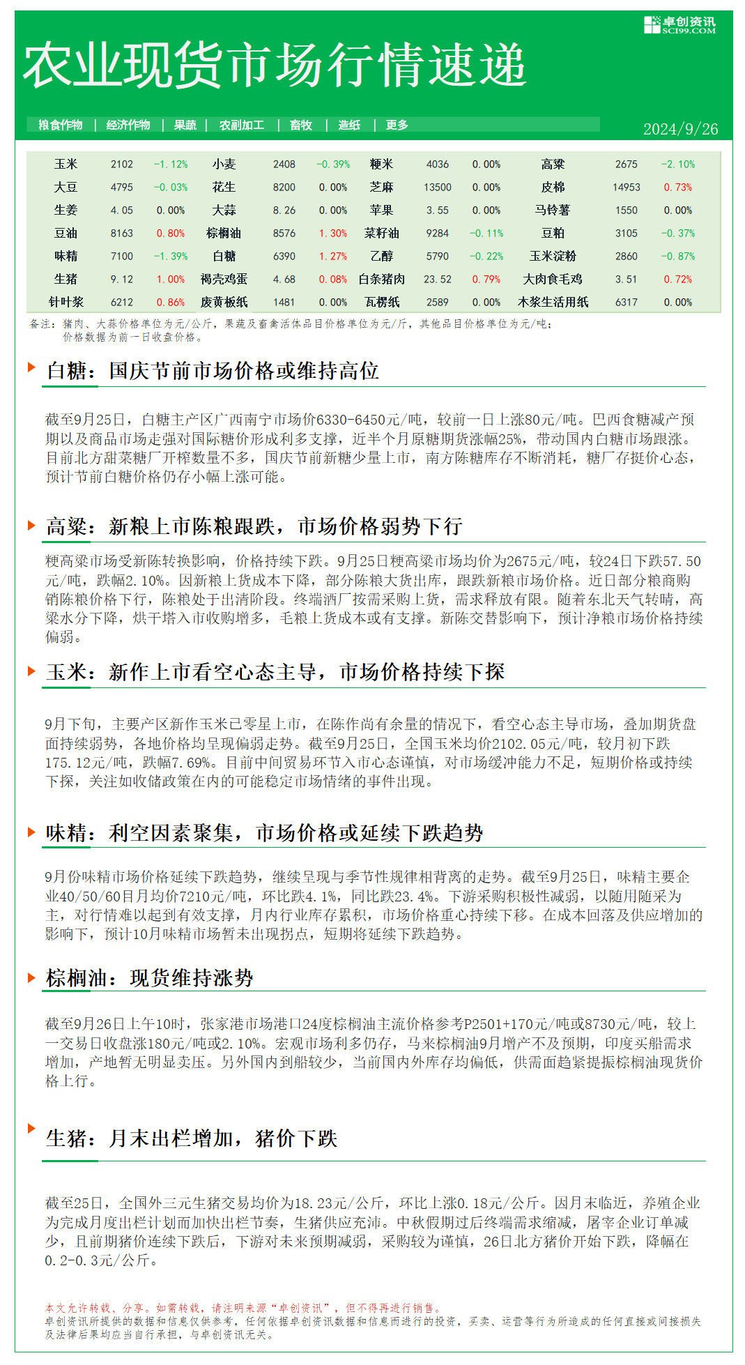 截至9月25日,卓创资讯监测数据显示,农业行业28个重点现货品种价格中,有9个上涨,9个下跌,10个稳定。其中,棕榈油价格涨幅最大,涨幅1.30%;高粱价格跌幅最大,跌幅2.10%。