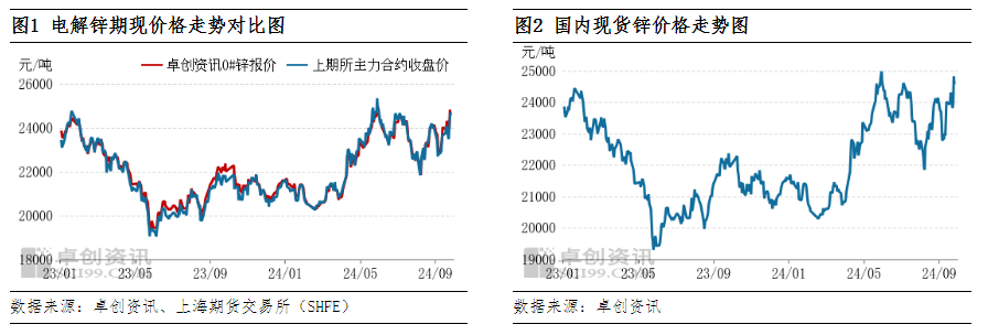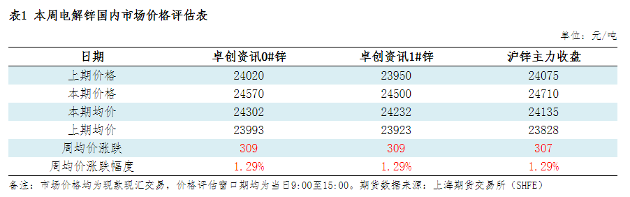 截至发稿卓创资讯现货0#锌锭周均价为24302元/吨,均价较上期涨1.29%;1#锌锭周均价24232元/吨,均价较上期涨1.29%。