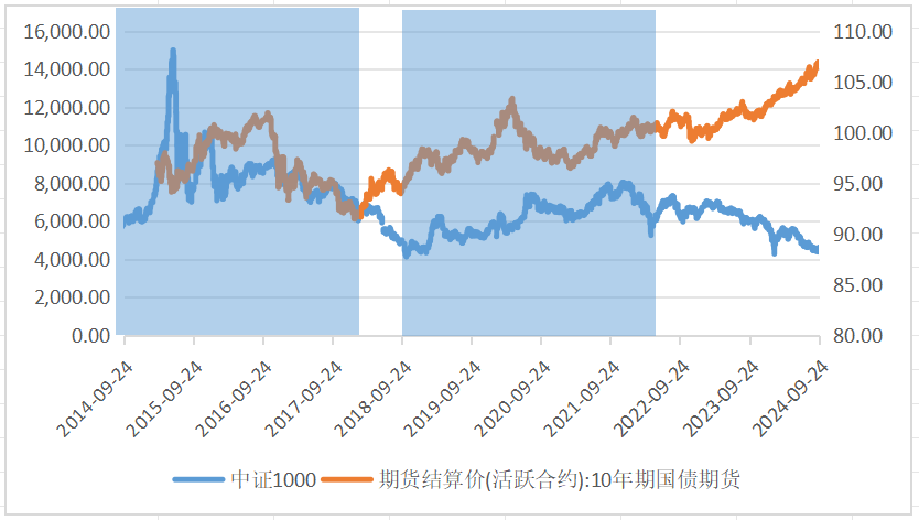 回顾国债期货上市以来,中证1000指数在15-17年,19-22年之间大多数时间周期出现国债和指数同涨。可见国债的牛市对中证1000等小盘指数而言压力偏小,未来两年低利率背景下,中证1000的上涨空间相对于其它股指期货而言空间较大。