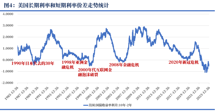 目前美债利率到挂的利率结构并没有修正,自上世纪90年代以来,一旦长短期利率倒挂持续一定周期皆伴随着市场危机。