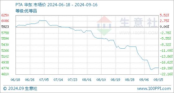 9月16日,生意社PTA基准价为4792.50元/吨,与本月初(5383.00元/吨)相比,下降了-10.97%。