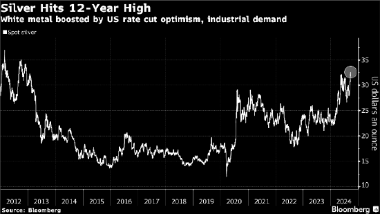 白银价格周四触及2012年以来的最高水平,同时金价再创历史新高,对美联储进一步降息的预期提振了贵金属。